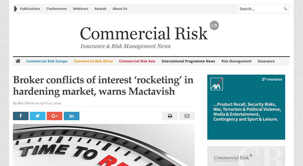 Commercial Rick Online reports that “Broker conflicts of interest Rocketing in hardening market, warns Mactavish"